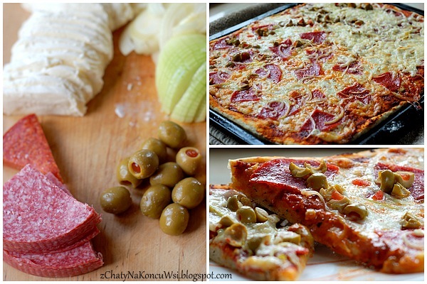Ciasto smaruję sosem, układam ser mozzarella a na nim salami i cebulę oraz oliwki ale tylko na mniejszej, mojej części. Pizzę piekę w piekarniku nagrzanym do 220 C przez 15-20 minut. Na 6-8 minut przed końcem posypuję dodatkowo startym żółtym serem.