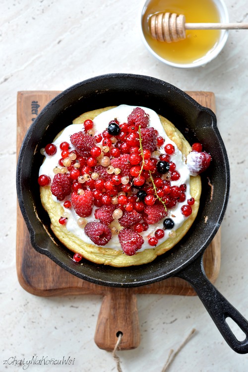 edit – dopisek lipiec 2016: Dziś przypomniałam sobie o tym przepisie, zrobiłam go na bardzo późne śniadanie. Jestem na urlopie, Łukasz i Wiktor we Wrocławiu to mogę sobie pozwolić na chwilę lenistwa 🙂 Na krzakach dojrzewają owoce, przygotowałam więc omleta z jogurtem greckim, świeżymi owocami i kroplą miodu. Jakie to jest pyszne !