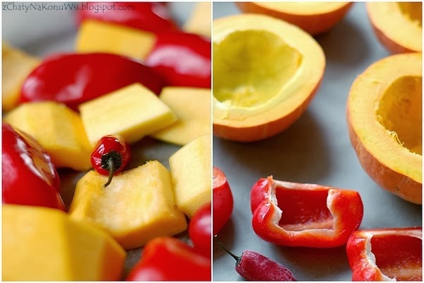 Piekarnik nastawiam na 190 stopni. Dynię kroję na mniejsze kawałki, wydrążam nasiona i obieram (zrobiłam tak tylko raz i wam też polecam oszczędzić sobie pracy i piec w skórce). Paprykę pokrojoną na 3-4 części pozbawiam nasion i białych błonek. Na blaszce piekarnikowej układam przygotowaną dynię, paprykę i papryczkę chilli w całości. Wkładam do piekarnika na godzinę w tym czasie przygotowuję bulion u mnie jest to zazwyczaj wywar z warzyw i kurczaka ale można użyć również kostkę rosołową … choć osobiście polecam ugotować wywar.