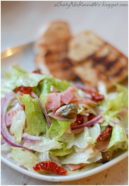 Szynkę i pomidory kroję w paseczki, cebulę w półplasterki . Sałatę rwę na mniejsze kawałki dodaję pokrojone pomidory, szynkę i cebulę. Odcedzone kapary mieszam z pozostałymi składnikami i polewam sosem winegret. Podaję z kawałkiem grillowanego pieczywa.