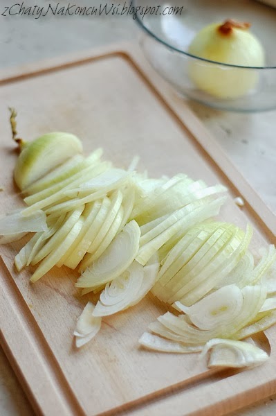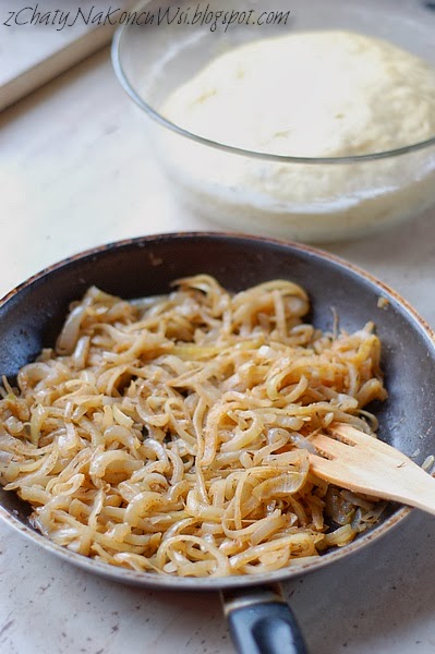 W czasie gdy ciasto rośnie przygotowuję nadzienie. Na patelni rozpuszczam smalczyk i wrzucam pokrojoną w cienkie półplasterki cebulę. Dodaję przyprawy i duszę do miękkości a następnie odstawiam do ostygnięcia.
