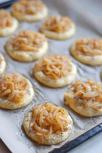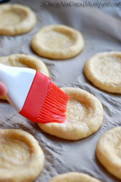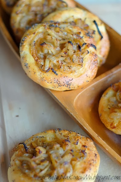 Tak przygotowane ciasto smaruję rozbełtanym białkiem i na każdym układam przygotowaną wcześniej, wystudzoną cebulę. Na koniec ranty bułeczek obsypuję makiem lub kminkiem.
