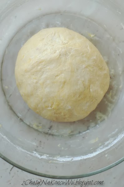 Pokruszone drożdże zasypuję cukrem, zalewam ciepłym mlekiem i dodaję 2 łyżki mąki. Wszystko dokładnie mieszam, przykrywam ściereczką i odstawiam w ciepłe miejsce do wyrośnięcia. Smalczyk rozpuszczam i odstawiam do przestygnięcia. Do dużej miski przesiewam mąkę, dodaję wyrośnięte drożdże, smalczyk, jajo i żółtko. Mieszam wszystko łyżką a następnie wyrabiam rękami aż ciasto będzie elastyczne i nie klejące. Z ciasta formuję kulę odkładam do miski i odstawiam w ciepłe miejsca do podwojenia objętości.