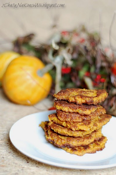Rozbełtane jajko mieszam z dyniowym puree. Dodaję kaszę, mąkę i przyprawy. Smażę na złoty kolor na klarowanym maśle. Dla pozbycia się nadmiary tłuszczu po usmażeniu wykładam na ręczniki papierowe. Podaję z mięsnym sosem, jogurtem, powidłami … i oczywiście dorzucam do lunchbox’a 🙂