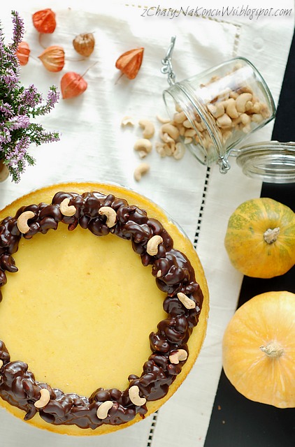 Pyszny, delikatny, aksamitny – mogę śmiało napisać, że w dyniowym sezonie to mój nr jeden. Pewnie już wspominałam, że serniki to nie jest moja mocna strona i boje się eksperymentować. Bardzo zależało mi żeby się udał bo obiecałam upiec sernik na imieniny mojej Mamy 🙂 Zajrzałam do Kwestii Smaku i stamtąd zaczerpnęłam przepis na masę, odrobinę go zmieniłam. Reszta to moja wariacja na temat czekolady i słonych orzechów – bardzo lubię takie połączenie.