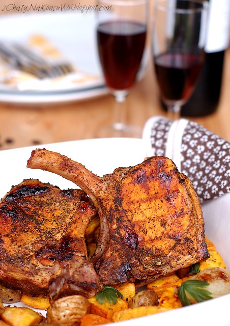 Kotlety z obu stron nacieramy przygotowaną wcześniej przyprawą. Smażymy na patelni grillowej lub bezpośrednio na grillu, 6-7 minut z każdej strony. Odstawiamy aby chwilę odpoczęło i podajemy z warzywami oraz kieliszkiem wina.