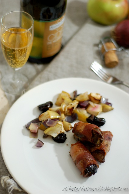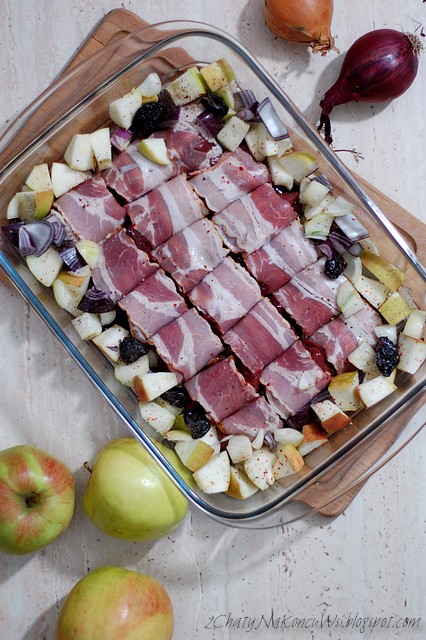 Jabłka i cebulę kroję na duże kawałki dodaję pozostałe śliwki i mieszam z ziołami, solą, majerankiem oraz świeżo mielonym kolorowym pieprzem i rozkładam dookoła roladek. Całość podlewam cydrem w którym moczyły się śliwki i zapiekam w piekarniku nagrzanym do 180 stopni (góra-dól + termoobieg) przez 20-25 minut.