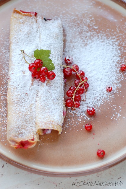 Naleśniki smaruję ricottą i frużeliną na wierzchu rozkładam porzeczkę, zwijam w rulon i układam w posmarowanym masłem naczyniu do zapiekania. Wierzch smaruję roztrzepanym jajkiem i wstawiam do piekarnika nagrzanego do 180 stopni. Zapiekam przez 20 minut po wyjęciu oprószam cukrem pudrem.