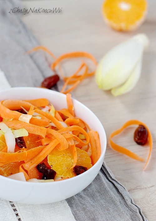 Używając obieraczki do warzyw kroję marchewkę w cienkie plasterki, zalewam zimna wodą i odstawiam na 10 minut. Oliwę mieszam z cytryną, sokiem z pomarańczy, przeciśniętym czosnkiem oraz płynnym miodem dorzucam pokrojone w plasterki daktyle. Cykorie kroję w półplasterki. Pomarańcze obieram, usuwam białą błonkę, kroję w plasterki. Osuszoną marchewkę mieszam z cykoria i pomarańczą, układam na talerzu polewam sosem i podaję.