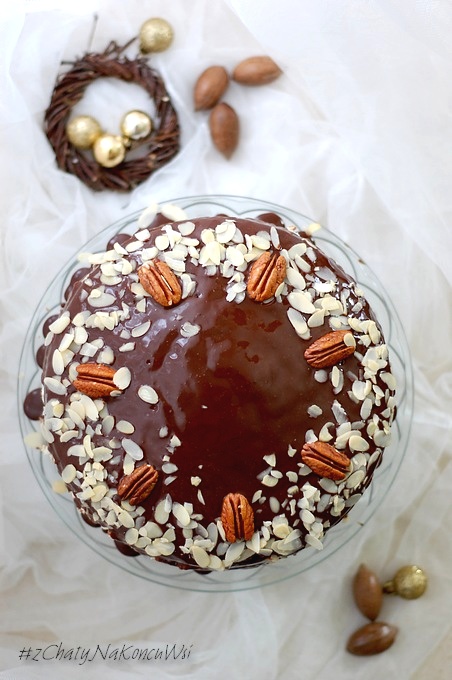 Czekoladę rozpuszczam w kąpieli wodnej mieszam ze śmietanką i polewam nią ciasto. Dekoruję płatkami migdałów i orzechami.