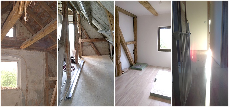 Po ośmiu latach udało nam się zrobić remont piętra domu i to było chyba największe wyzwanie. Ze strychu na którym był tylko bałagan i kilka niepotrzebnych ścian udało nam się stworzyć miejsce które jest w 100% nasze. Z niczego powstało małe mieszkanko w którym czujemy w końcu się jak u siebie. Biel, drewniane belki, świeżo i dziewiczo, daje nam to jeszcze wiele możliwości wykończenia. Przed nami jeszcze dużo pracy i pieniędzy do zarobienia zanim powiemy – gotowe ! Metamorfoza jest jednak powalająca i najchętniej w ogóle nie schodziła bym na dół … niestety nie mam tam kuchni 🙂