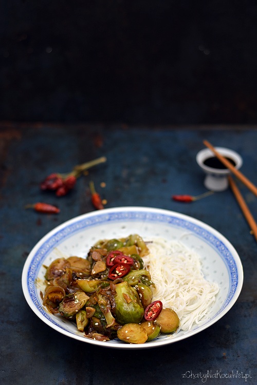 W woku rozgrzewam olej, wrzucam cebulę i smażę ją 1-2 minuty, dodaję chilli oraz czosnek. Dorzucam brukselkę, następnie cukier i sos ostrygowy, smażę razem 3-4 minuty. Dodaję sos sojowy i podgrzewam jeszcze przez chwilę. Dorzucam makaron mieszam.