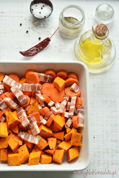 Dynie myję, usuwam pestki i razem ze skórka kroję w grubą kostkę. Marchewkę obieram ze skórki, kroję w grube plastry. Mieszam z oliwą, ziołami i chilli, doprawiam solą oraz pieprzem.