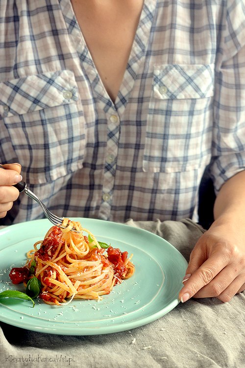Gotowy sos doprawiam do smaku solą dorzucam posiekane listki bazylii. Makaron przekładam do sosu bezpośrednio z garnka w którym się gotował. Nie odcedzam makaronu tylko wyciągam go z wody i przekładam do sosu.