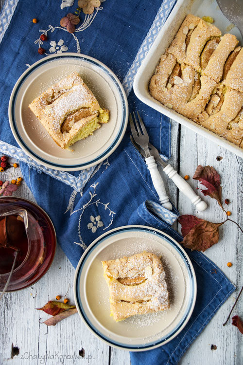 Szybciutkie, lekkie i słodkie ciasto, na przełamanie słodyczy polecam użyć kwaskową odmianę jabłek. Antonówka, Gloster, Jonagold, Lobo, Reneta czy stara polska odmiana Papierówka będą idealne. Ciasto nie zawiera proszku do pieczenia, nie ma rosnąć tylko się zapiec. Dzięki temu nie jest suche a na wierzchu tworzy się delikatna, chrupiąca warstwa.