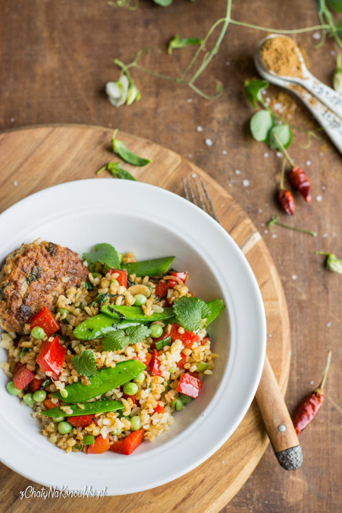 Bulgur doskonale rozumie się z wyrazistymi przyprawami, bardzo lubię w kuchni używać chilli, imbir czy kumin a melisa doda świeżości i podkreśli jeszcze smak. Kaszę gotuję na sypko, do tego przyprawy, warzywa i zioła. Gdyby nie to, że musiałam się podzielić sama kasza mogła by stanowić cały mój obiad. Ale że było nas dwoje dorzuciłam Kotlety z bobu i ziemniaków 😉